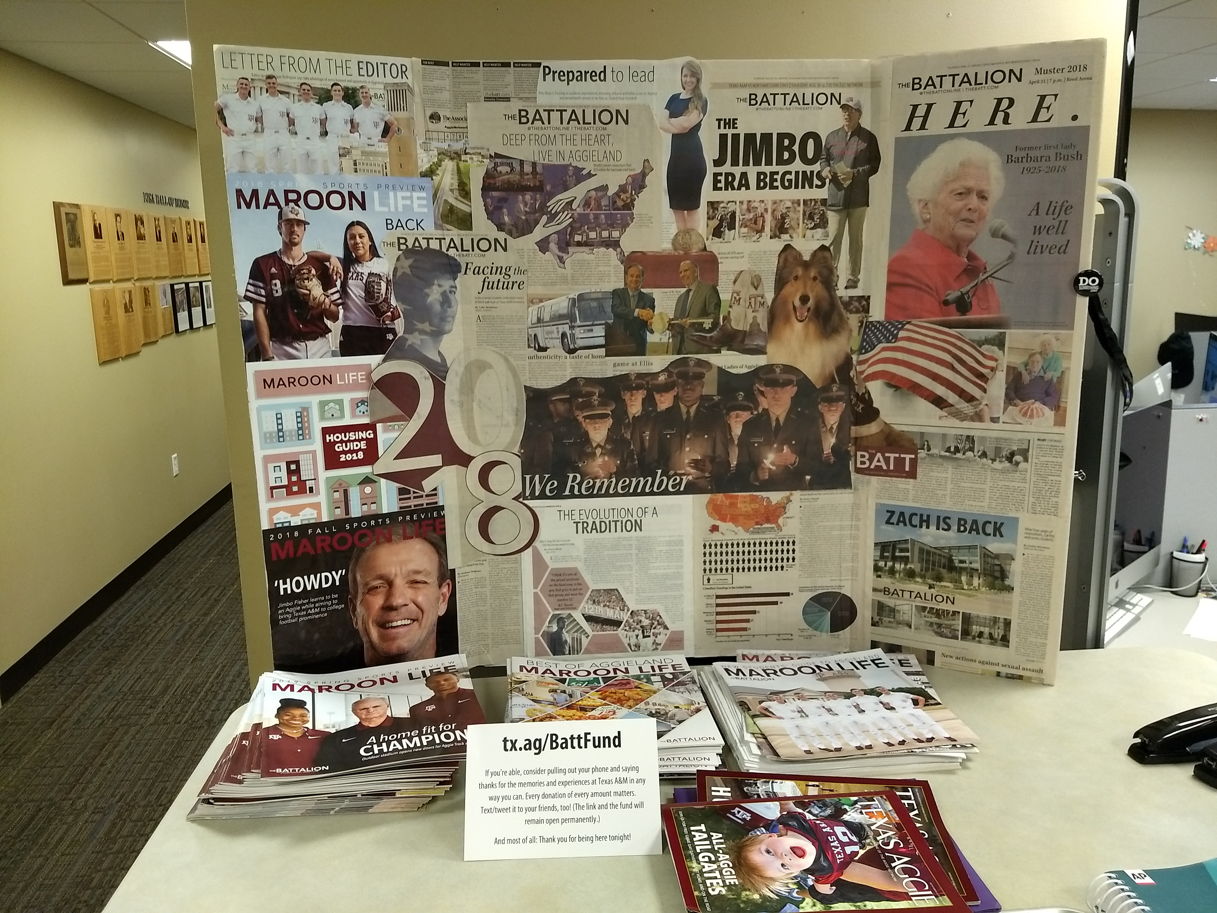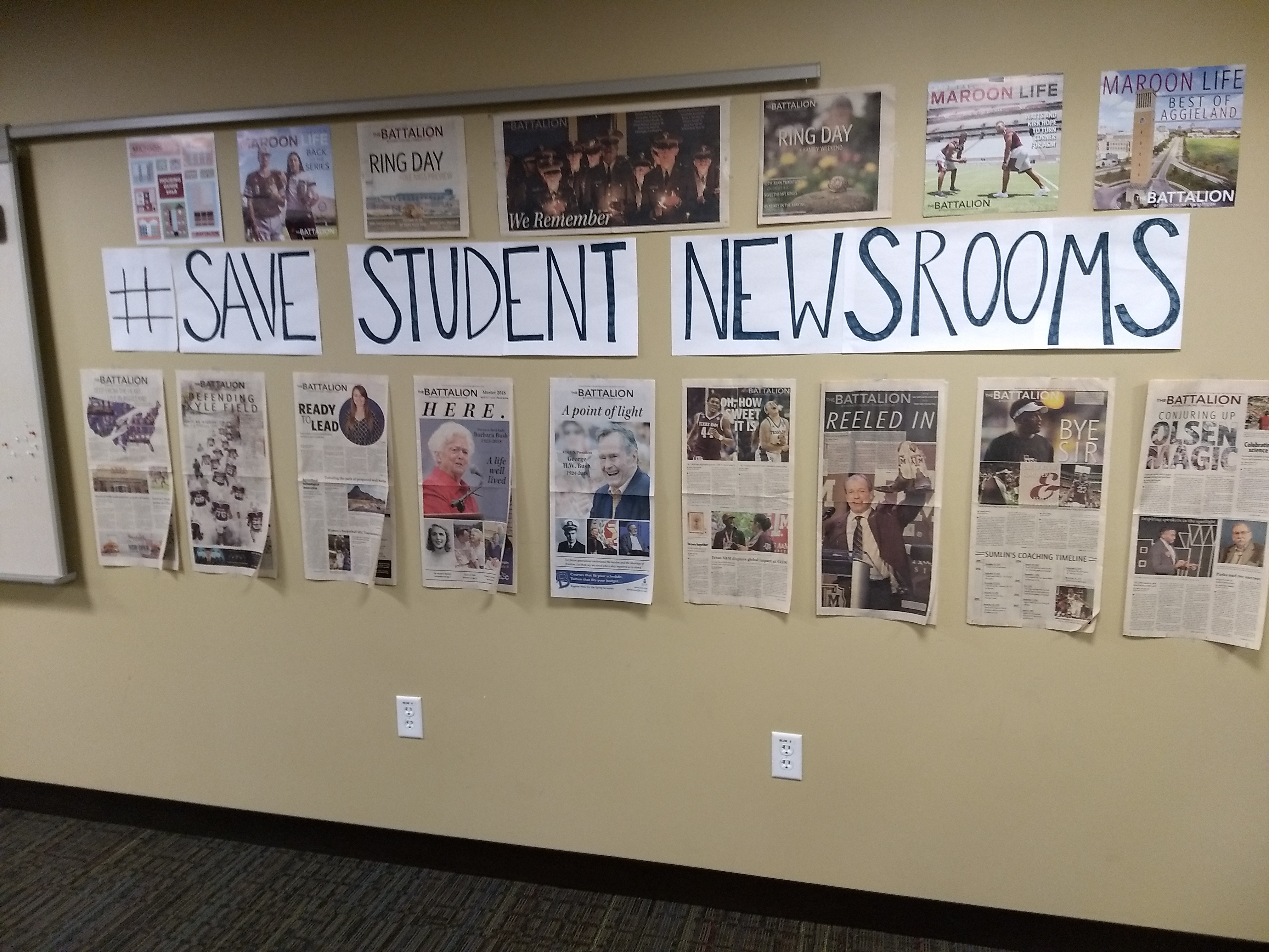 I won’t say being in the present-day Batt newsroom gave me chills. But it definitely built in me a sense of pride in the young women and men still coming through the TAMU journalism program and getting so much invaluable experience. And, as you can see in the photo with the #SaveStudentNewsrooms banner, they’ve also learned to fight for survival — just as many of them will start doing when they walk through the doors of their first newspaper gigs as A&M graduates.