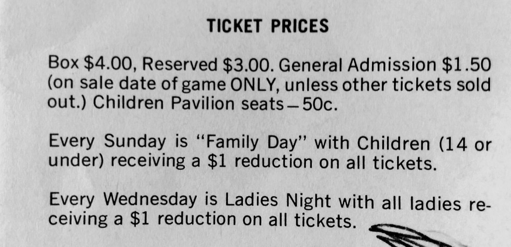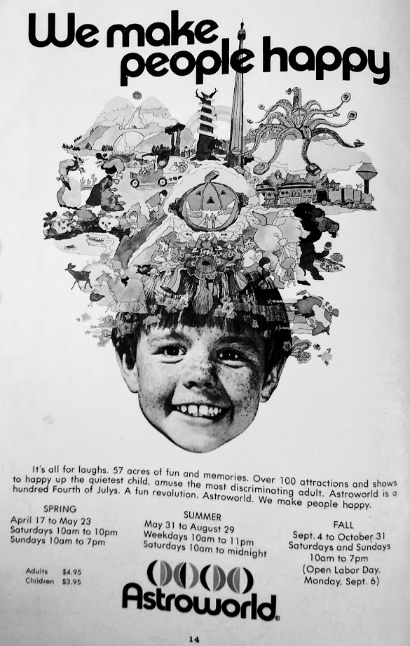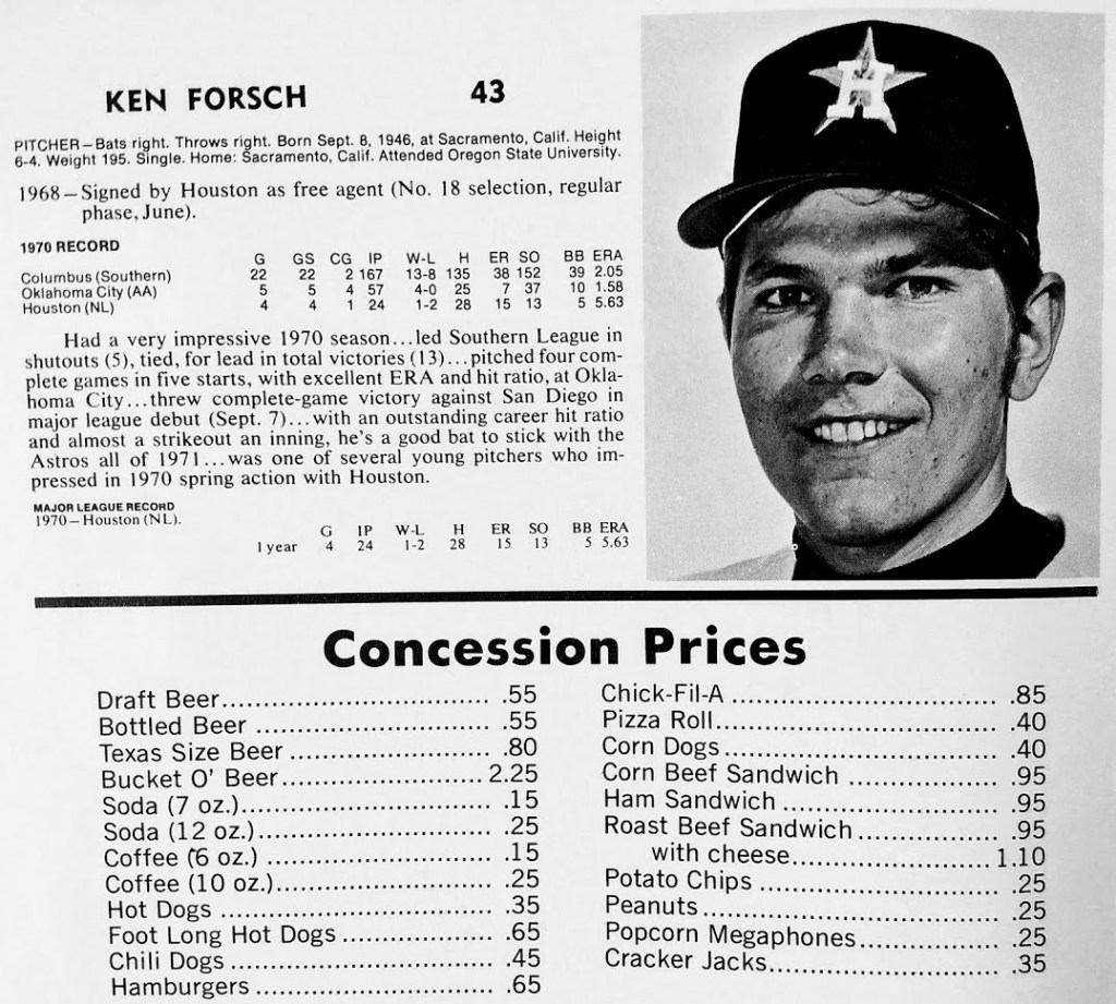 And look at those ticket and concessions prices! Box seats $4, general admission $1.50! Beer 55 cents and hot dogs 35 cents. Hamburgers 65 cents! Anyone remember the “Popcorn megaphones”? And love the Astroworld ad — did it really only cost $3.95 for children and $4.95 for adults to get in?