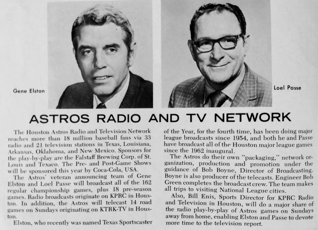 By the time I was 7 in 1968, in third grade after having been bumped into first at age 5 at St. Matthew Lutheran School on the outskirts of downtown, my Astros fandom was in full swing. I became fast friends with Paul Sweitzer and John Reed, and we’d compare notes at school most mornings about the previous night’s game — often losses — that we’d listened to on the radio, feeling like we were sitting right there in the stands, thanks to the stellar play-by-play and color of Gene Elston and Loel Passe. My brother Isaac and I spent years often keeping our own box scores while listening at home, using cardboard from the boxes of Dad’s “samples” from his work as a longtime lingerie salesman for Hollywood Vassarette.