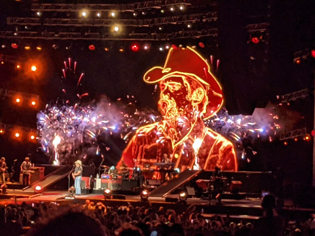 The concert started out with a couple of acts we’d never heard of — Kameron Marlowe, who was just OK, and then a guy we thought was fantastic, Jimmie Allen. He’s a rare Black artist to find big success in country music and has had a couple of No. 1 songs, although we weren’t familiar with him. They also both came out and performed during Brad’s set, which lasted about 90 minutes.
