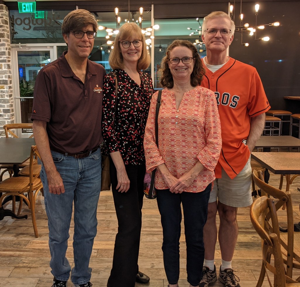 The other memorable part of our quick trip to Houston came after the not-so-memorable game, which we left after 8 innings, when the score was 9-3 (so we missed the Astros’ Yuli Gurriel and Jason Castro hitting solo homers in the ninth). We met my dear college friend Beverly Fluke and her husband Bob for a late dinner and spent about an hour and a half filling one another in on the goings-on in our lives. I last saw them a couple of years ago for an Astros-Yankees playoff game, and Kay saw them the year before (I think) when we all went to a regular-season game. I met Beverly my freshman year at Texas A&M, when she was a senior at Bryan High, and Bob was a year ahead of me in school and we lived in the same dorm, Moore Hall, although we didn’t know each other.