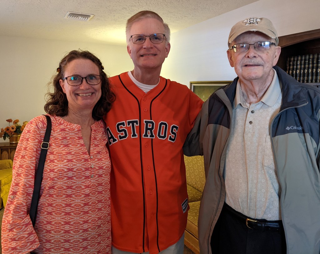 On the way down, as Kay and I stopped to get gas in The Woodlands, across I-45 from where my family lived in Oak Ridge North starting in December 1971 when I was a couple of months from turning 11, I called our old across-the-street neighbor Earl Cornelsen to ask if we could stop by and visit. I hadn’t seen him in about three years, and he said he was just listening to the UT-Oklahoma State game and would love to see us. Earl turned 84 in February and lost his wife Linda six years ago, and he’s nearly blind as a result of glaucoma that he developed over 40 years ago.