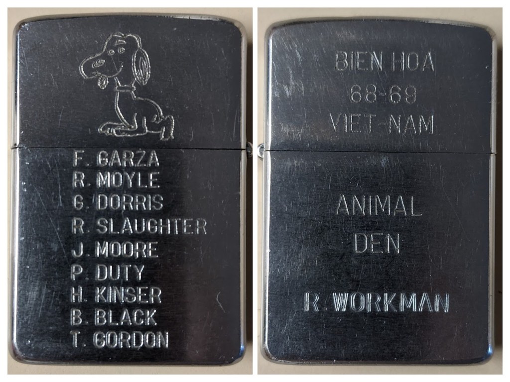 When Robin died, Barb generously gave me the Zippo lighter that he and his AF comrades exchanged as gifts while they were stationed in Nam. The names of the members of the “Animal Den,” the hut where he and his unit were assigned, are inscribed on it, along with Snoopy. In April 2014, a little over five years after Robin’s death, I started thinking about the lighter and how it would be cool to try to find any of his buddies listed on it to see what memories they might have of Robin from his time in Vietnam.