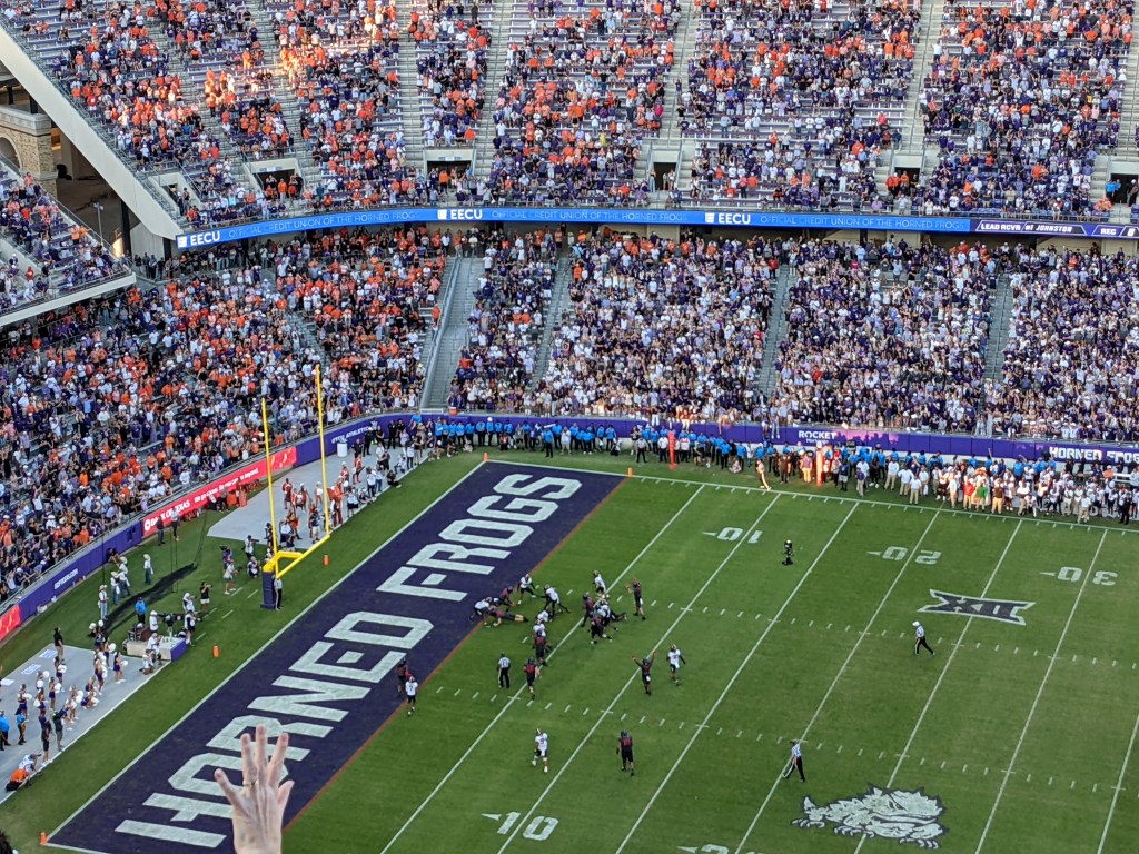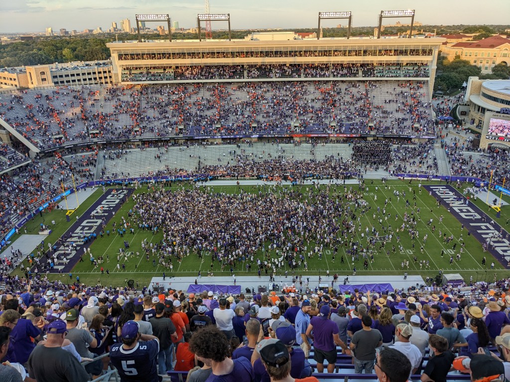 Afterward, I asked Kay if she’d thought the Frogs would rally to win and she admitted she didn’t — even after what we’ve seen them do. The game lasted just under 4 hours and the temps were in the 90s — but luckily, our seats on the west side of the stadium were in shade from opening kick through the end of the Frogs’ sixth win without a loss.