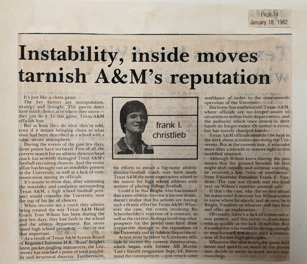 I was excited to take on the sports editor’s job but would’ve preferred to ease into it with a little less hullabaloo (see what I did there, Ags?). No such luck — the biggest news of my Batt tenure broke in January ’82 as A&M officials, including the board of regents, surreptitiously embarked on a search for a new athletic director who would also be the school’s head football coach. All the while, they repeatedly insisted the AD job was the only one they were looking to fill, since it was the only position open. Did they really think anyone was buying that hogwash?