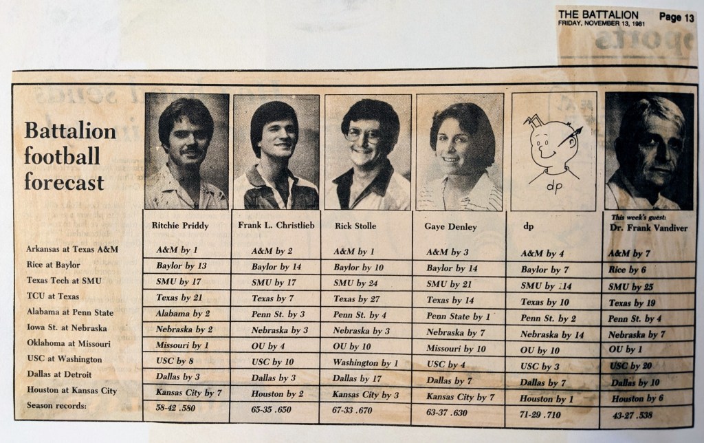 But covering sports for my college newspaper, interviewing too many athletes and coaches to count, being part of an awesome team effort at The Battalion — and getting paid to do it (although how much has slipped from my mind’s grasp) — will always rank No. 1 when I think of my four years at Texas A&M.