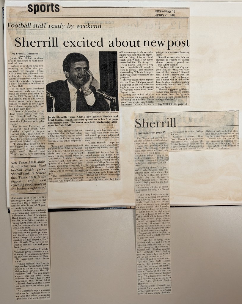 On Jan. 19, 1982, my dear friend Denise Richter — who sadly passed away last February — and I wrote a front-page story for The Batt announcing Sherrill’s hiring as coach and AD, as he became college football’s first coach with a total contract topping $1 million. Considering current A&M coach Jimbo Fisher’s laughably colossal contract, it’s crazy to fathom where we were 41 years ago on the landscape for coaches’ contracts.