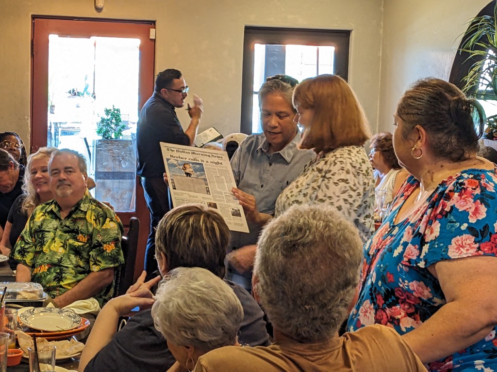 I attended a wonderful lunch Sunday with about 20 great friends and former Dallas Morning News colleagues at Meso Maya in Dallas. We were there to fete Denise Beeber, who retired Sept. 1 after spending almost 30 years at the newspaper as a news editor instrumental in ensuring that the DMN published every day. Denise was one of my supervisors a big chunk of my 22 and a half years at The News, and my main boss during my last five before I left for UT Southwestern Medical Center almost a year to the day before she retired.
