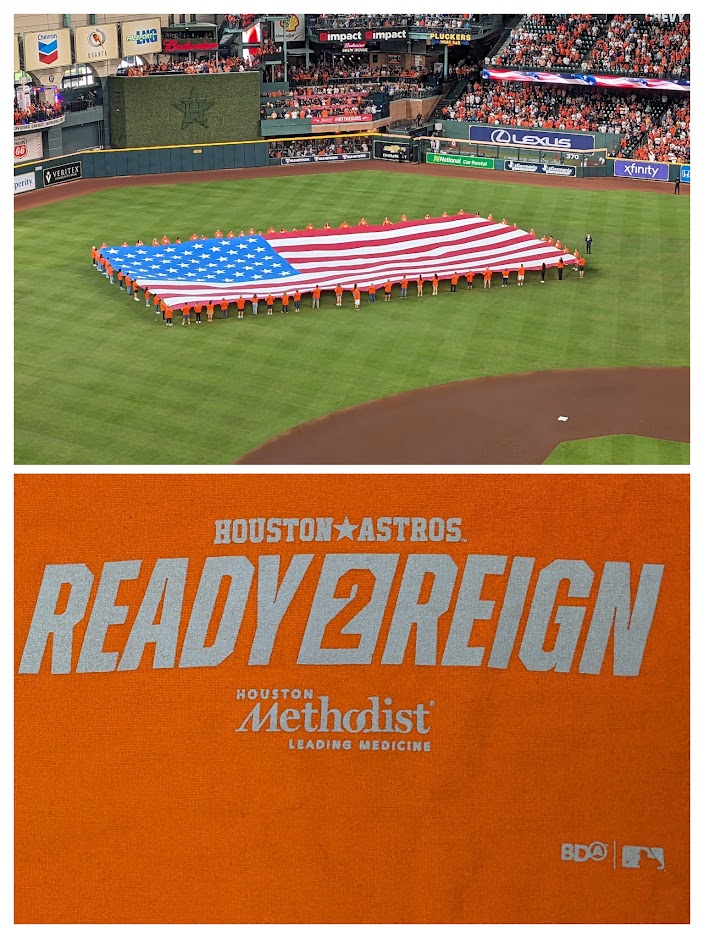 Everything worked out great. We even got to spend time visiting before the game with Gerald and his sister Doris, who were seated below us but not far from our upper-deck seats just on the third-base side of home plate. Unfortunately, we didn’t have a chance to see my Conroe friend David, who was there with his sister and is part of an ongoing Astros friends group text I started a couple of years ago.