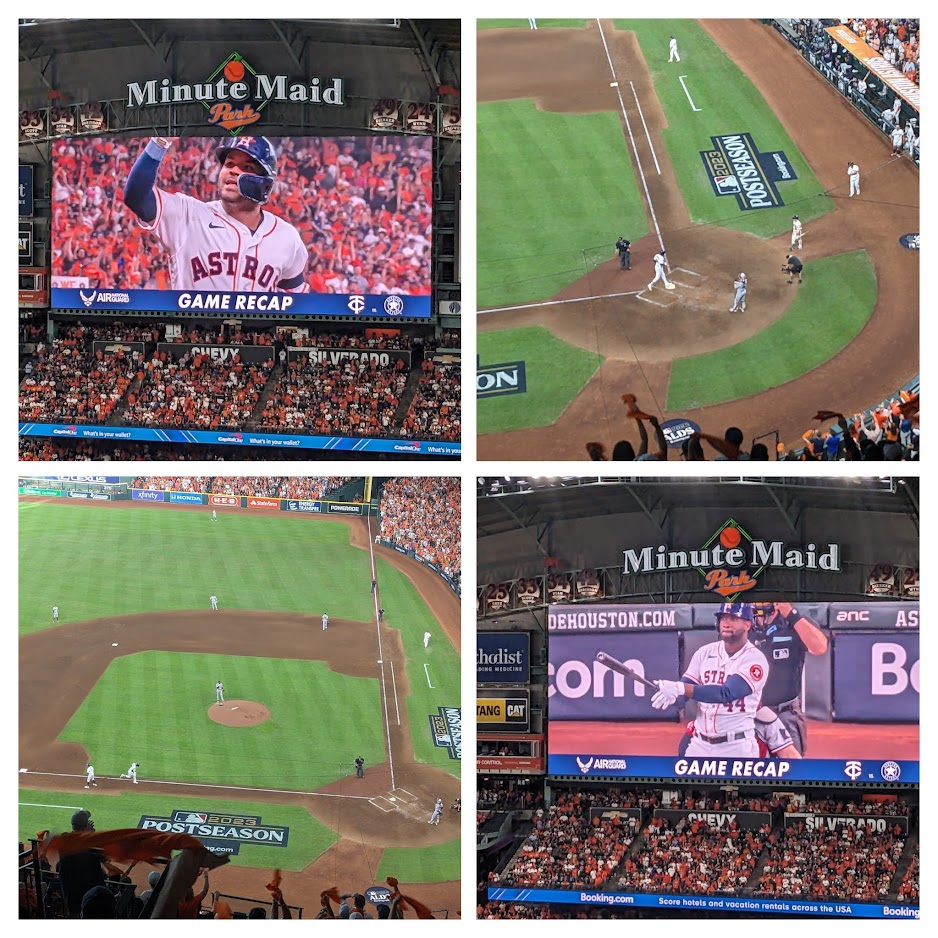 Game 1 of the Astros-Twins AL Division Series was two days ago … and here I am just now posting about my trip to Houston to soak in all the thrills and magic of the baseball playoffs. All I can say is, if you’re a baseball fan – or even if you’re not – and you’ve never gone to a playoff game – one involving your team or any other – you’re missing something truly glorious.