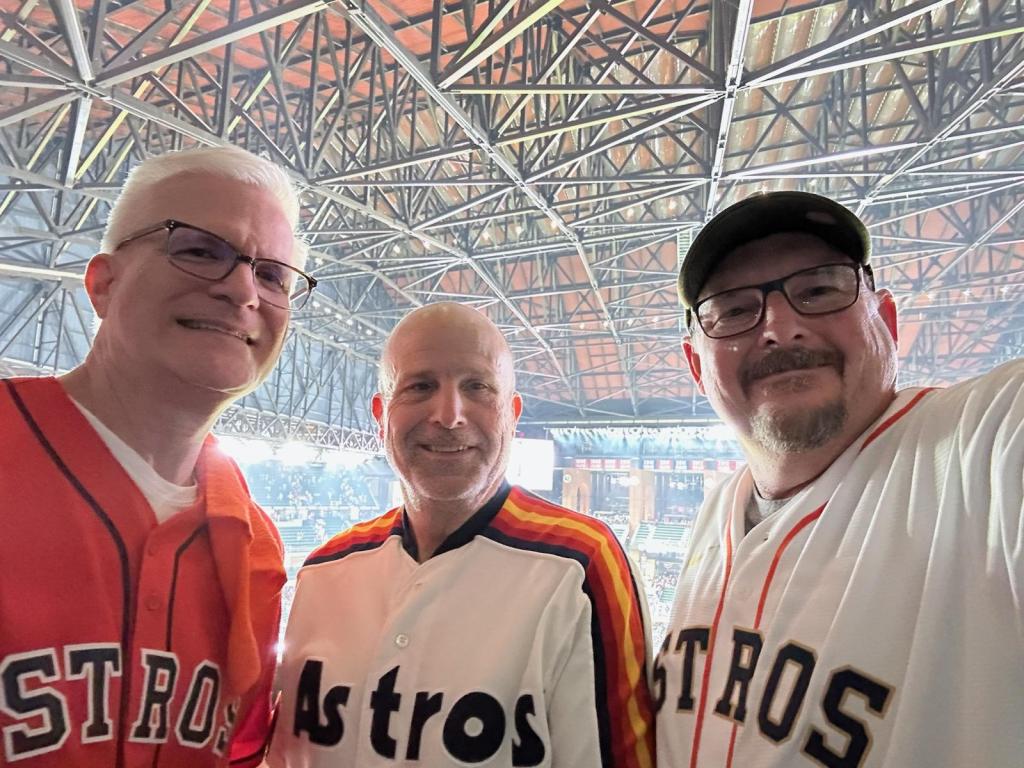 My elementary school friend John Reed (center) and my high school and college friend Randy Higgins joined me for Wednesday’s Game 3 of the Astros-Rangers ALCS showdown. Randy, an Army veteran, will be at Game 4 with his son Thursday, and I’ll be there with my friend Karl.