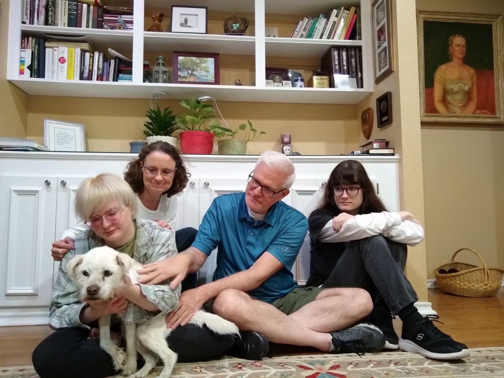 We took this family photo with Maisy on Friday afternoon, not long before Kay and I brought her to the vet to make her journey to the Rainbow Bridge. Our kitty Teena walked by, but it would’ve been difficult to corral her to join us.