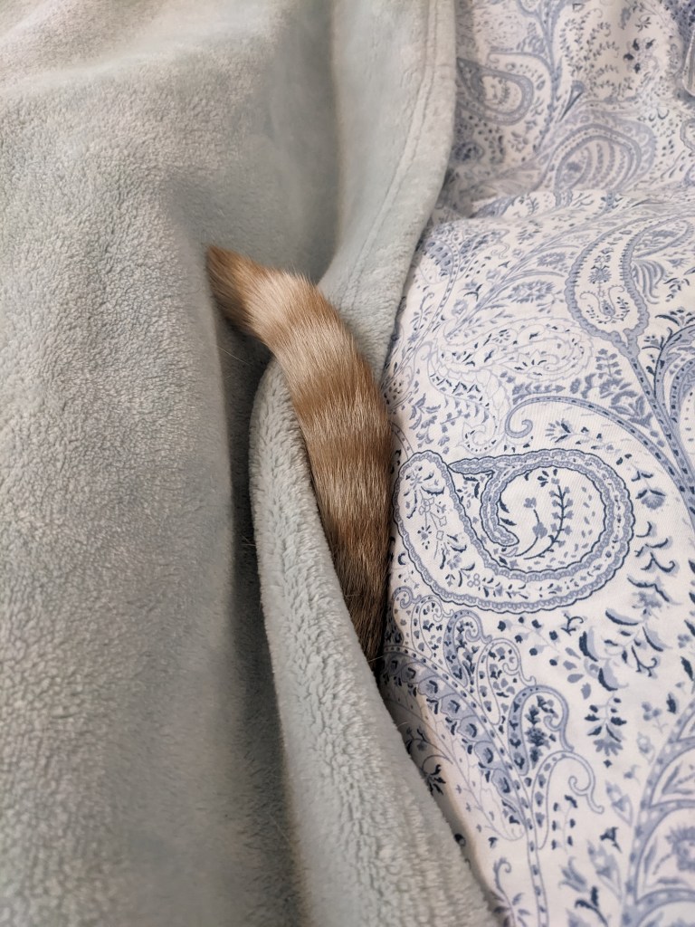 But the main reason for this post — in addition to sharing the peekaboo pic of our 12-year-old kitty Teena’s tail that I snapped today — is to give you an update on my health. Many of you have asked/wondered what’s been going on with my pulmonary embolism, and I sincerely appreciate your care and concern.