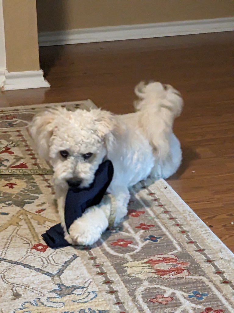 We know she’s a puppy (8 months old now), but we’re dog people and have had them forever, including puppies, and we’ve never had one as mischievous and all-out wild as Win was most of the time. Poor Kay was covered in Band-Aids and bruises because no matter what we said or did, Win would not stop biting all of us. She wasn’t trying to hurt us, of course, but she would bite (or try to) any body part she could reach, even when we were just trying to pet her. If my face was close to hers and she felt the urge, she’d bite my face. Fortunately, my reactions were usually quick enough.
