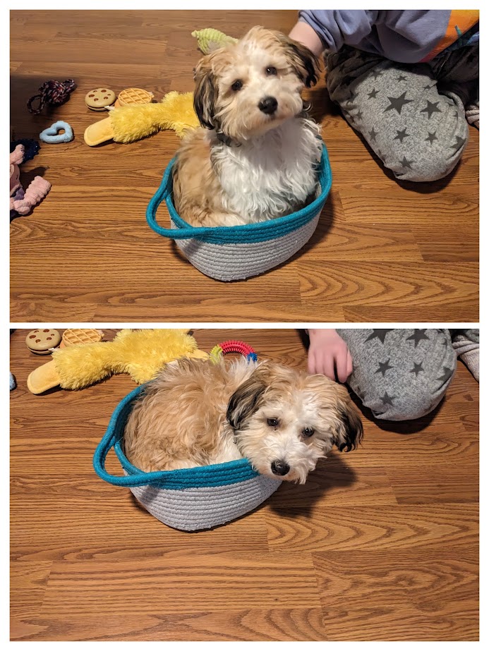 In these photos, Archie is next to our 20-year-old Alex and curled up in an adorable basket given to us full of doggie toys by my sister-in-law Phyllis Christlieb. Archie loves squeezing his little body into it with a toy or a treat. He also loves to chew on the basket, of course, but we hope it’ll last a while. 🙂 ❤